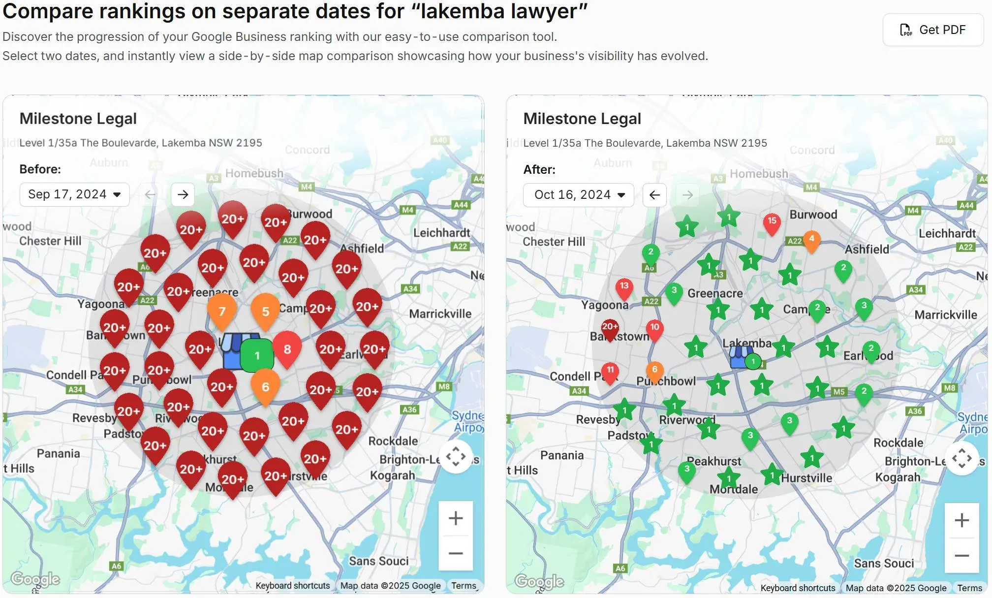 - Coverage — 82% in the Top‑3 for “Lakemba lawyer” across the same 5 km (3 mi) radius on Google Maps.