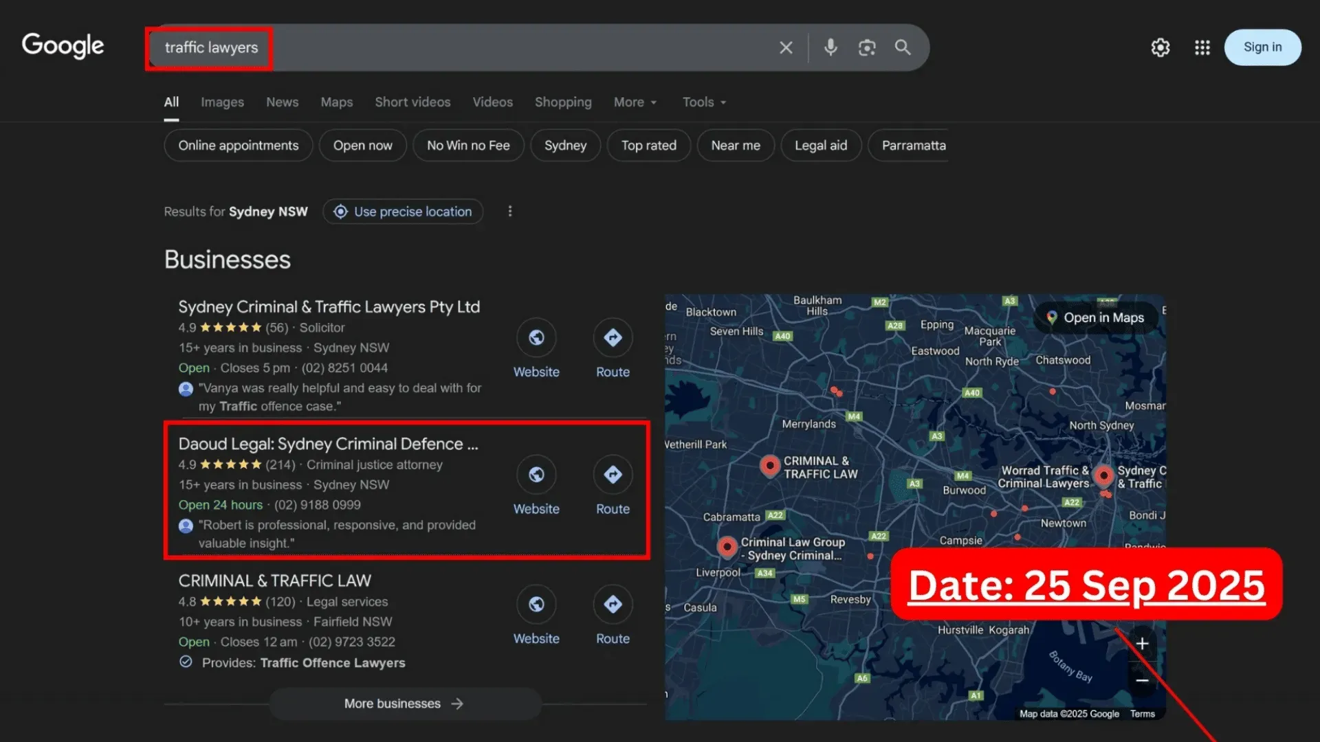 - Top-3 in Google Maps across 90% of Sydney for “traffic lawyer Sydney" & "criminal lawyer Sydney"